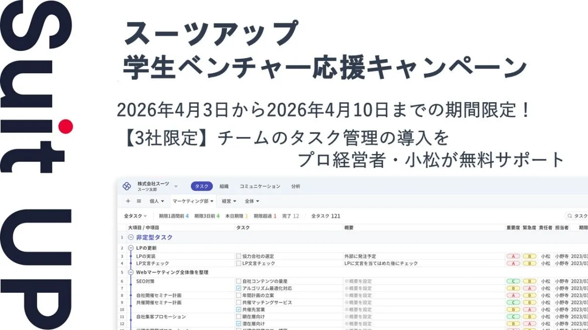 東京都千代田区に本社を構える株式会社スーツは、AIを活用したタスク管理・プロジェクト管理ツール「スーツアップ」の学生ベンチャー支援キャンペーンを発表しました。期間中に応募した学生ベンチャーの中から3社を選び、月額料金を3ヶ月間無料で提供するというものです。