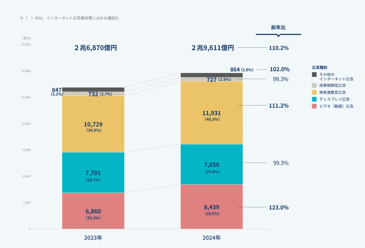 インターネット広告費の中から制作費やECプラットフォーム費を除いた媒体費は、ビデオ広告とソーシャル広告の成長を反映し、前年比110.2%の29,611億円に達しました。特にビデオ広告は、前年比123.0%という高い成長率を記録し、その市場規模は8,439億円に達しています。これら広告の中でも、インストリーム広告とアウトストリーム広告がほぼ同じ構成比(それぞれ50.5%と49.5%)を持つと報告されています。