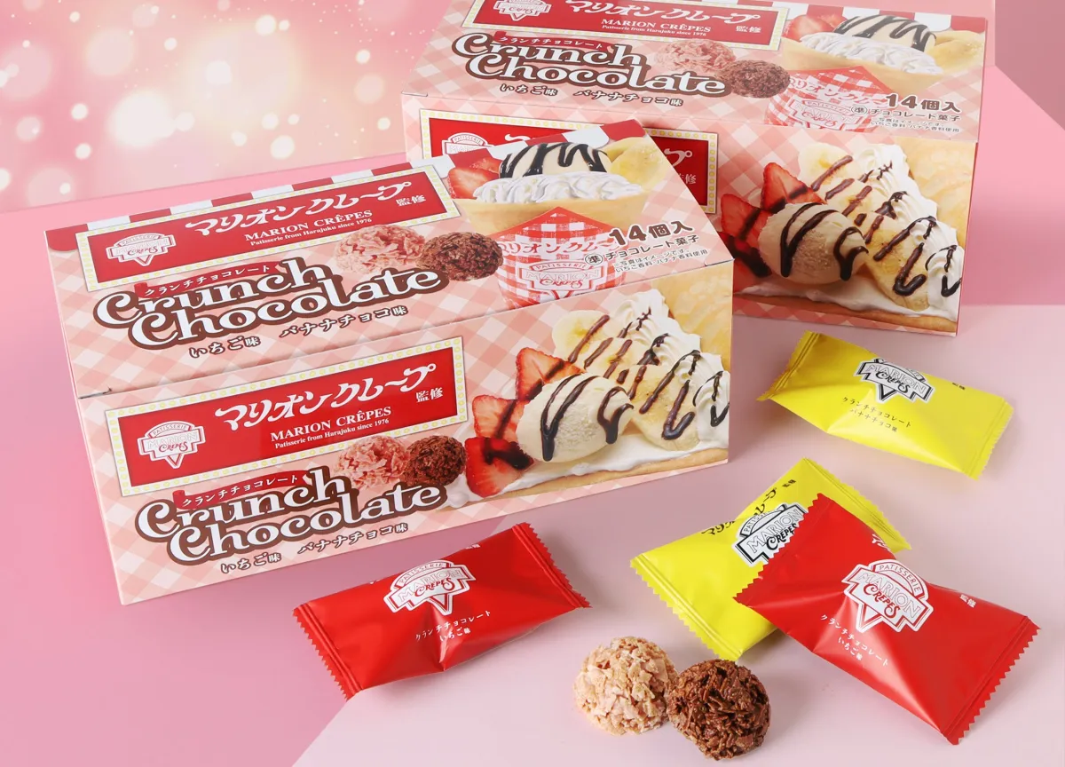 「クランチチョコBOX」には、2種類のクランチチョコが含まれています。一つは、いちごチョコクランチ。甘酸っぱいフレーバーが特徴で、サクサクとした食感が楽しめる魅力的な一品です。もう一つは、バナナチョコクランチ。まろやかなバナナの風味が口の中で広がり、こちらもリッチな味わいが楽しめます。これら二つの風味を組み合わせることで、マリオンクレープの人気メニュー「いちごバナナチョコスペシャル」そのままの味わいを感じることができるでしょう。