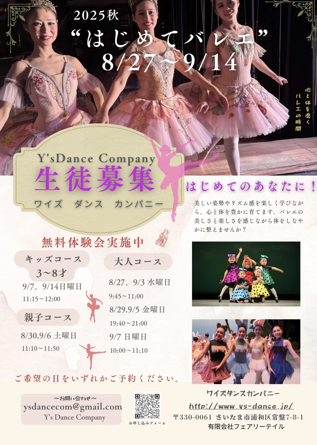 埼玉県さいたま市を拠点に活動するバレエスクール、Y's Dance Companyが、初心者を対象としたバレエ体験レッスンを開催します。このイベントは、2025年8月27日から9月14日までの期間中、さまざまな年齢層を対象にしており、バレエに初めて触れる方々にとって素晴らしい機会となっています。