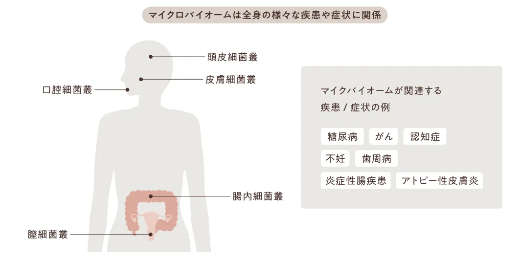 マイクロバイオームとは、ヒトの体内に存在する微生物の総称であり、腸内や皮膚、口腔内でさまざまな影響を与えています。最近の研究により、マイクロバイオームは糖尿病やがん、認知症、不妊症、アトピー性皮膚炎など、多くの疾患と関係があることが明らかにされています。特に、腸内フローラの状態は皮膚疾患や精神疾患にも影響を及ぼすことが知られており、その重要性が増しています。