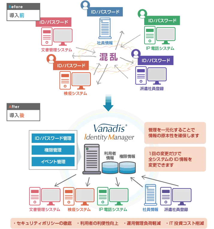 「VANADIS」は、企業内の複数のシステムにおけるID情報とアクセス権限を一元管理するためのソリューションです。これにより、セキュリティ向上だけでなく、ID管理の効率化やコスト削減が期待されます。また、内部統制やコンプライアンスにも強く対応しています。