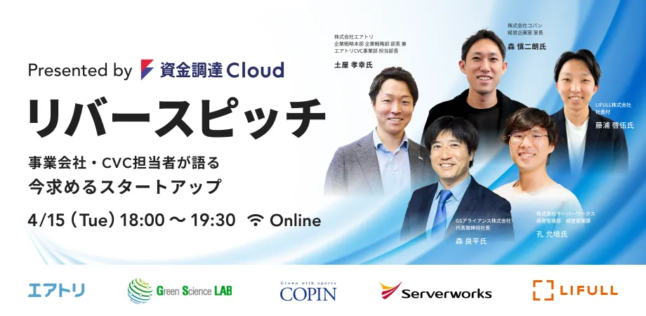 株式会社M&Aクラウド(本社:東京都千代田区)が運営する「資金調達クラウド」は、イベント「リバースピッチ第2弾」を2025年4月15日(火)に開催します。今回は、エアトリ、LIFULL、サーバーワークス、GSアライアンス、コパンの5社が登壇し、それぞれの企業が求めるスタートアップに向けた資金調達の戦略を共有します。