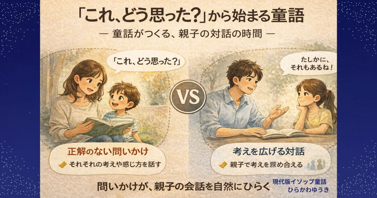 「現代版イソップ童話」は、こうした対話のきっかけを意図的にデザインしています。物語が終わった後も会話が続くことで、読む行為がただの娯楽ではなく、思考や人間関係を深める貴重な時間へと進化します。子どもたちにとっては、物語を通じて自己や他者を理解し、考える力を育むきっかけになります。また、大人にとっても、子どもとの対話を通じて自らの思索を深める貴重な場となるでしょう。