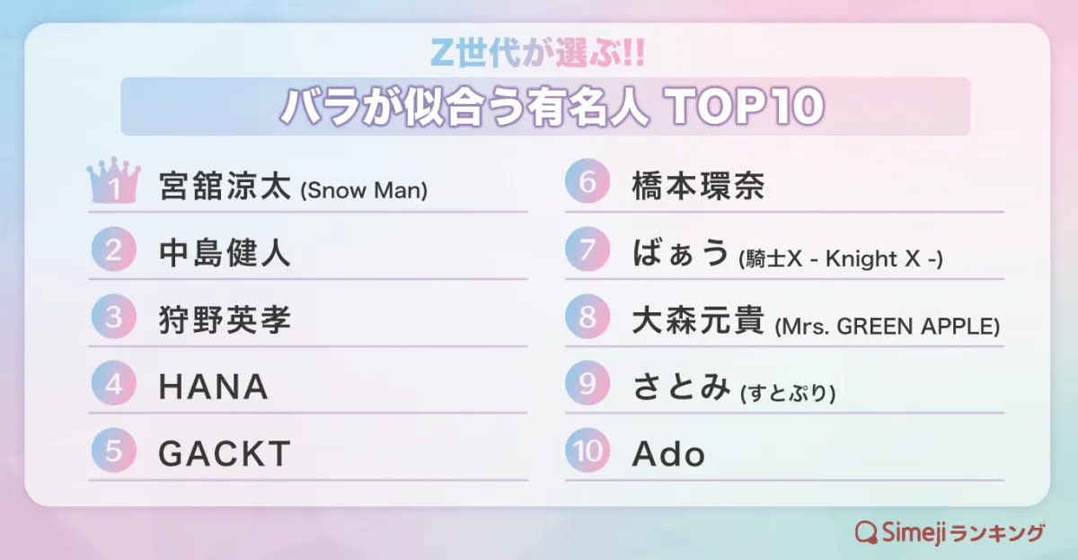6月2日の「ローズの日」を祝して、きせかえ顔文字キーボードアプリ「Simeji」がZ世代を対象に実施したアンケート調査の結果が発表されました。その結果は「バラが似合う有名人TOP10」にまとめられ、多くの若者たちが支持する有名人たちが登場しました。