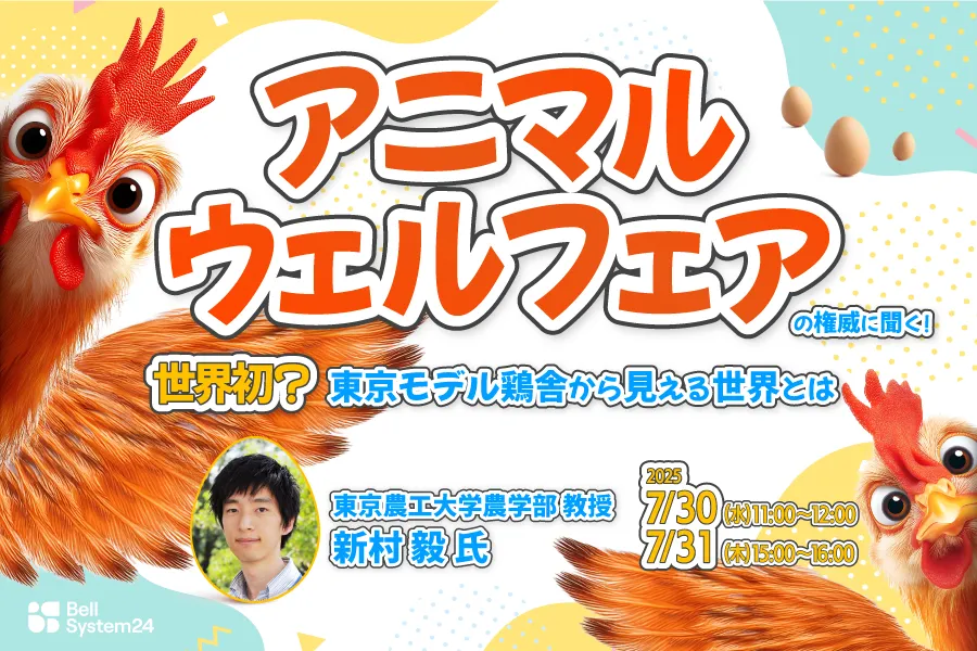株式会社ベルシステム24は、2025年7月30日(水)と31日(木)の2日間、イノベーターズラウンジ「アニマルウェルフェアの権威に聞く!世界初?東京モデル鶏舎から見える世界とは」を開催します。このセミナーでは、持続可能な食生活への関心が高まる中、動物福祉に関する重要なテーマを深く掘り下げていきます。