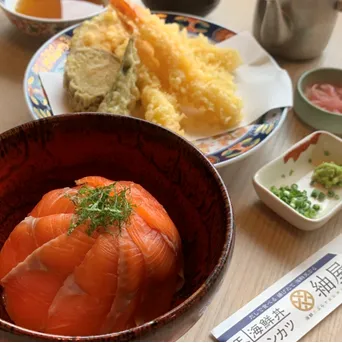 ビワマス丼、上天ぷら盛り合わせ、生姜漬け、薬味、味噌汁を含み、贅沢な一品です。