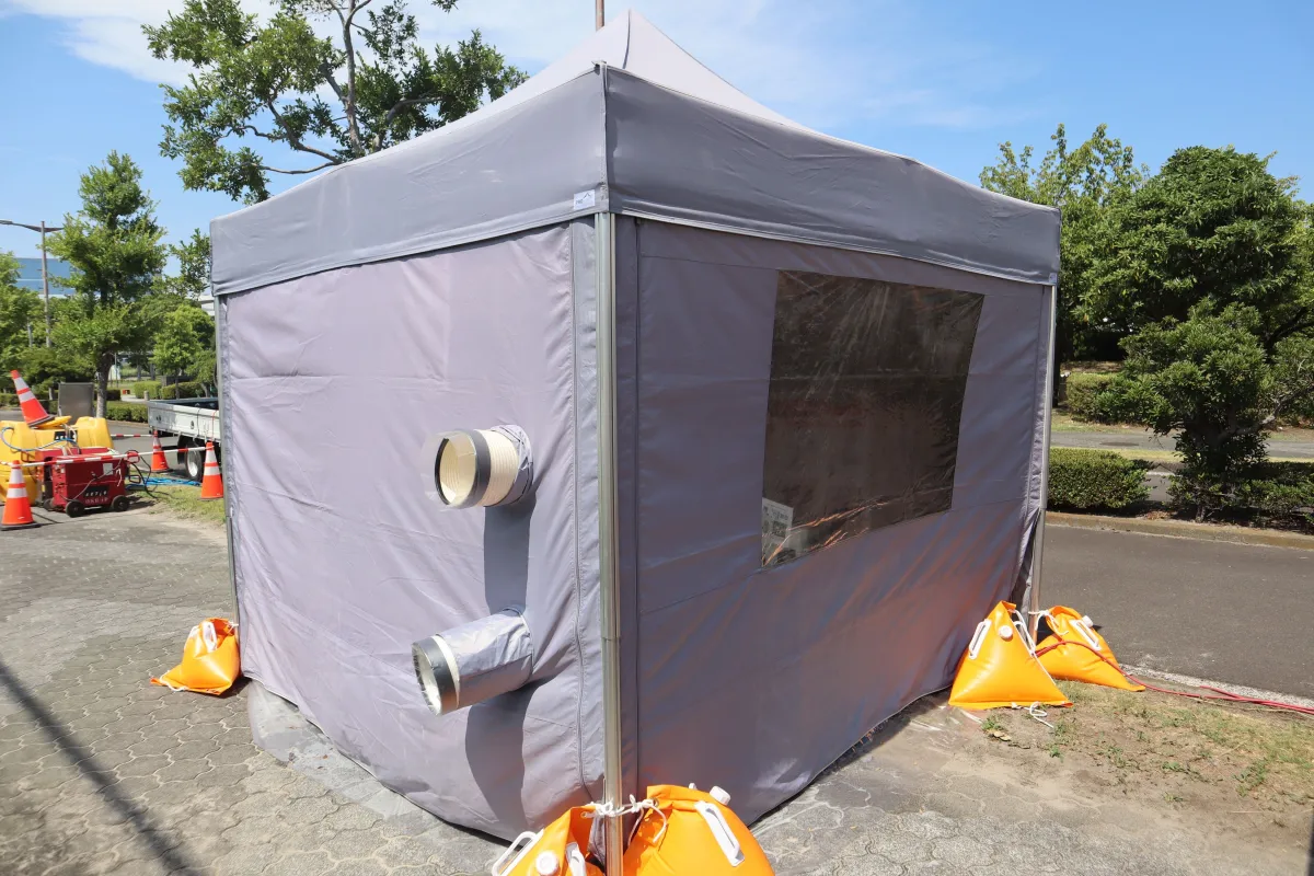 この製品はアルミフレームで構成される簡易休憩所です。誰でも簡単に組み立てられ、移動もラクラク。付属のクーラーは特許技術を用い、冷たい空気を循環させることで効率的に空間を冷やします。
