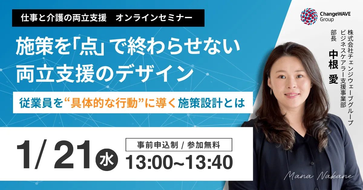 近年、介護を必要とする人が増加する中、企業に求められる課題はどんどん сложнееになっています。特に2025年4月からは、企業の義務として40歳以上の従業員に対し、介護保険制度や社内の両立支援制度についての周知が必要になります。この背景の中で、株式会社チェンジウェーブグループは2026年1月21日(水)に無料オンラインセミナーを開催します。