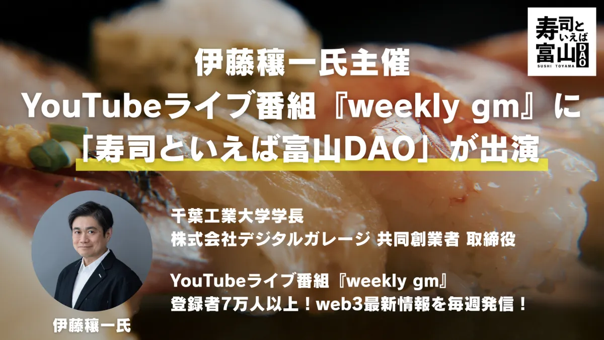 2025年7月18日(金)午前10時から、伊藤穰一氏主催のYouTubeライブ番組『weekly gm』に、富山のお寿司を盛りあげるオンラインコミュニティ「寿司といえば富山DAO」が出演します。これは、富山県の特産物である寿司をデジタル時代の力で拡大していく取り組みの一環として、多くの視聴者にアピールするものです。