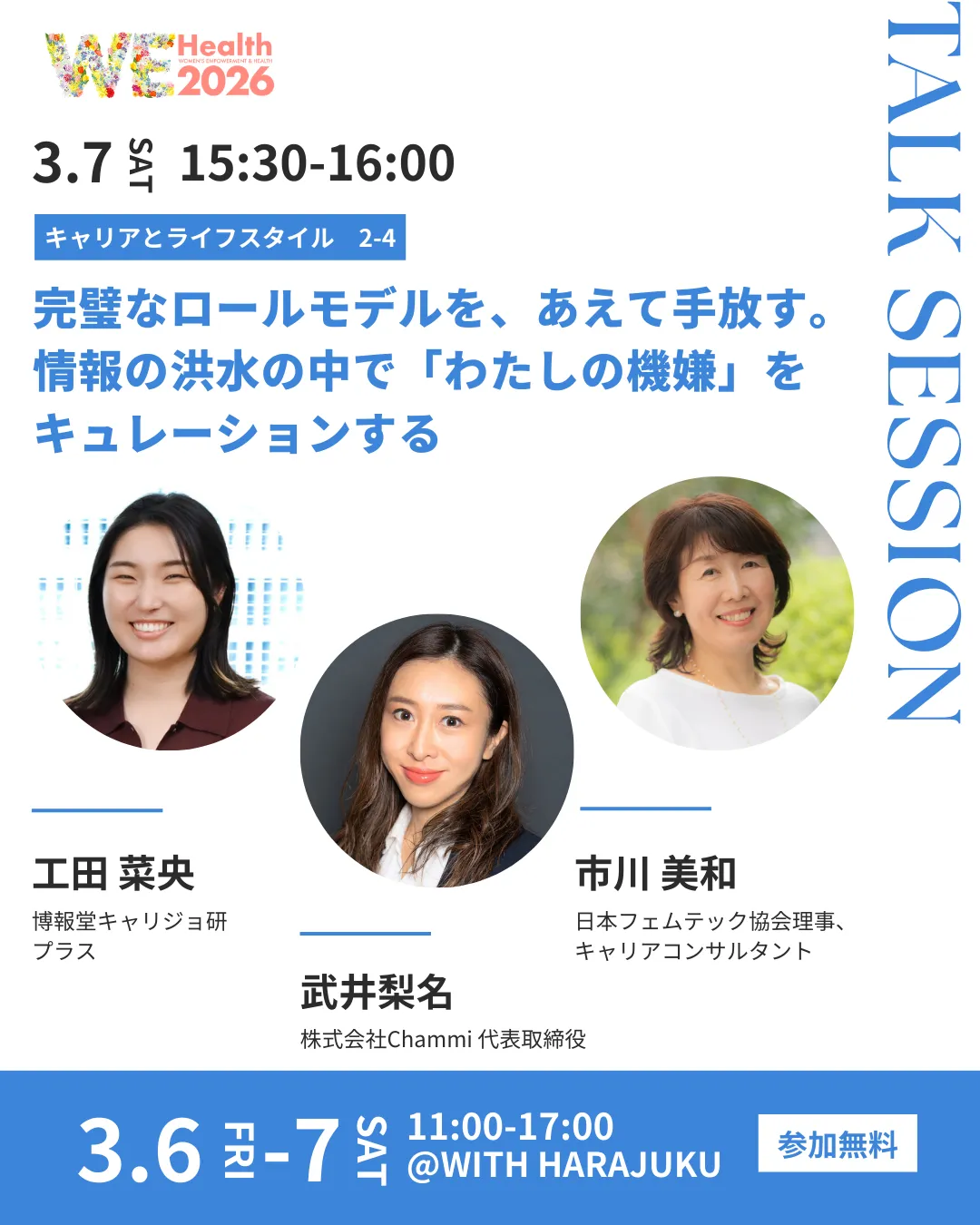 2026年3月6日と7日、東京・原宿の「WITH HARAJUKU」で行われる第6回「WEHealth2026」では、特別なトークセッションが開催されます。このセッションのテーマは、「完璧なロールモデルを、あえて手放す。情報の洪水の中で『わたしの機嫌』をキュレーションする」です。