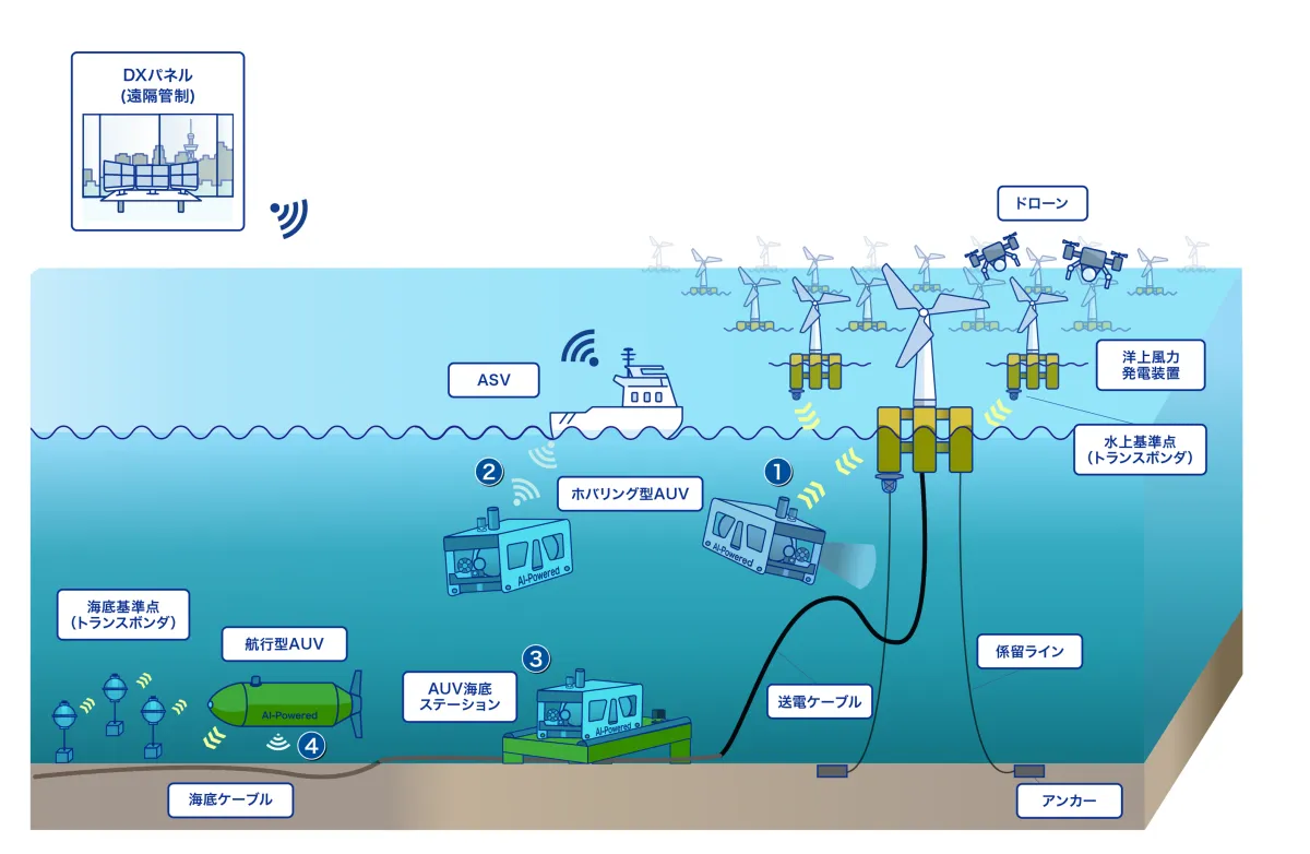 東洋エンジニアリング株式会社(TOYO)は、日鉄エンジニアリング株式会社(NSE)、株式会社FullDepth、沖電気工業株式会社(OKI)との共同で、洋上風力発電設備の点検業務を無人化するための新しいアプローチ、具体的にはAUV(自律型無人探査機)を使用した水中点検システムのロードマップを提案しました。