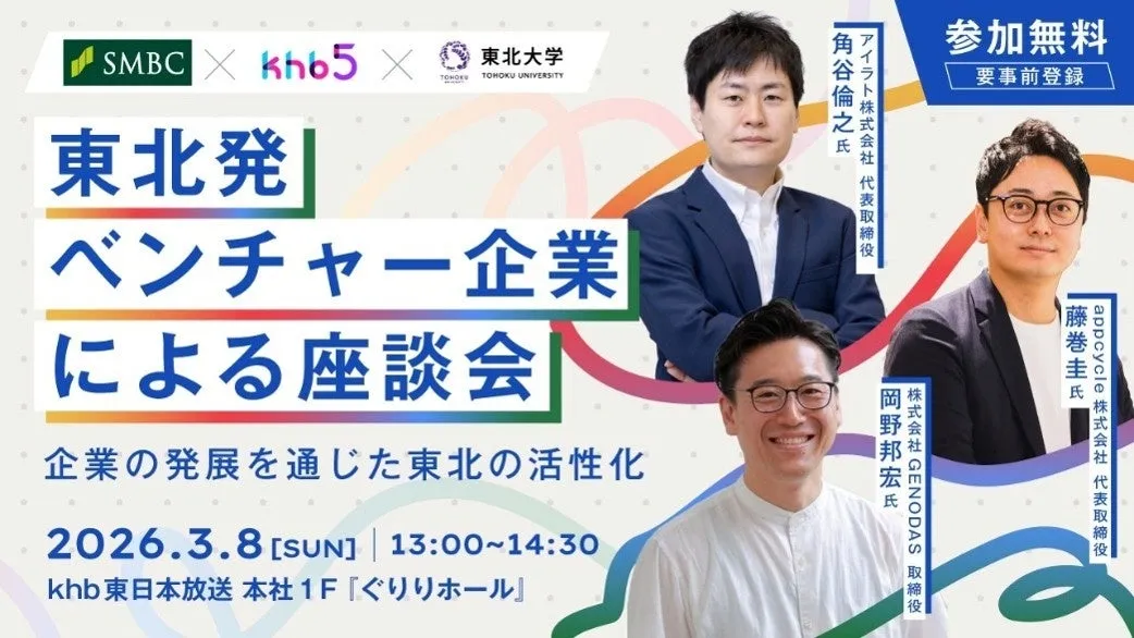 2026年3月8日、仙台市のkhb東日本放送本社にて、「東北発ベンチャー企業による座談会」が実施されます。主催は三井住友銀行、国立大学法人東北大学、そして株式会社東日本放送の三者で、このイベントは地域の活性化を目的としたものです。
