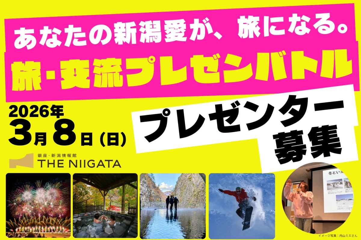 東京都中央区銀座に位置する『銀座・新潟情報館 THE NIIGATA』では、新潟の魅力を伝えるシリーズイベント『THE NIIGATA:Meet the People』を開催しています。このイベントでは、新潟の人々にスポットを当て、毎回多彩なプログラムを展開してきました。そして今回、参加者からの熱い声を受けて、初めての試みとして新潟愛をプレゼンする参加型イベント『あなたの新潟愛が、旅になる。~旅・交流プレゼンバトル~』を実施します。