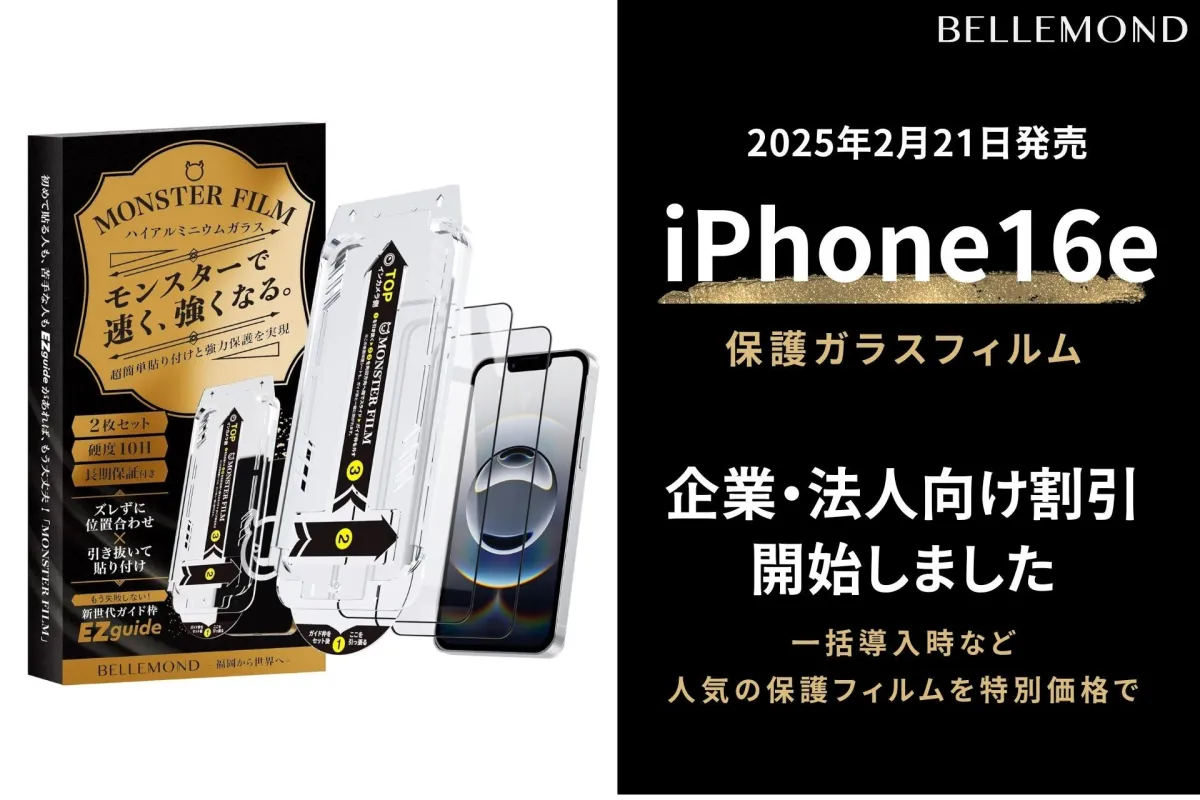 2025年2月21日に新型iPhone16eが発売され、これがiPhoneSE3の後継モデルとされる中、企業・法人向けの導入が進むと予想されています。スマホが業務に欠かせない存在となる中、適切な保護対策が求められています。そこで、福岡県大野城市に本社を持つFunStandard株式会社が運営するスマホアクセサリーブランド「BELLEMOND」が、iPhone16e専用の高耐久画面保護ガラスフィルム「モンスターフィルム」に法人向け特別割引を実施しました。
