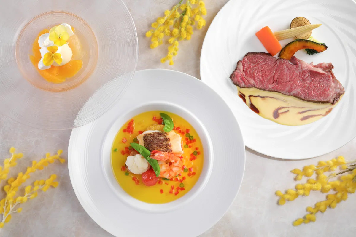 レストラン&ラウンジ・バー「eu」では、華やかなイエローに彩られた創作フレンチコース、名付けて「ミモザランチ」がリニューアルされます。4700円からのコースには、スモークサーモンとベーコンのサラダ仕立て、かぼちゃのクリームスープ、白身魚と海老のポワレ、牛肉のローストが楽しめます。デザートには柑橘のマチェドニアが添えられ、コーヒーか紅茶でのフィニッシュとなります。