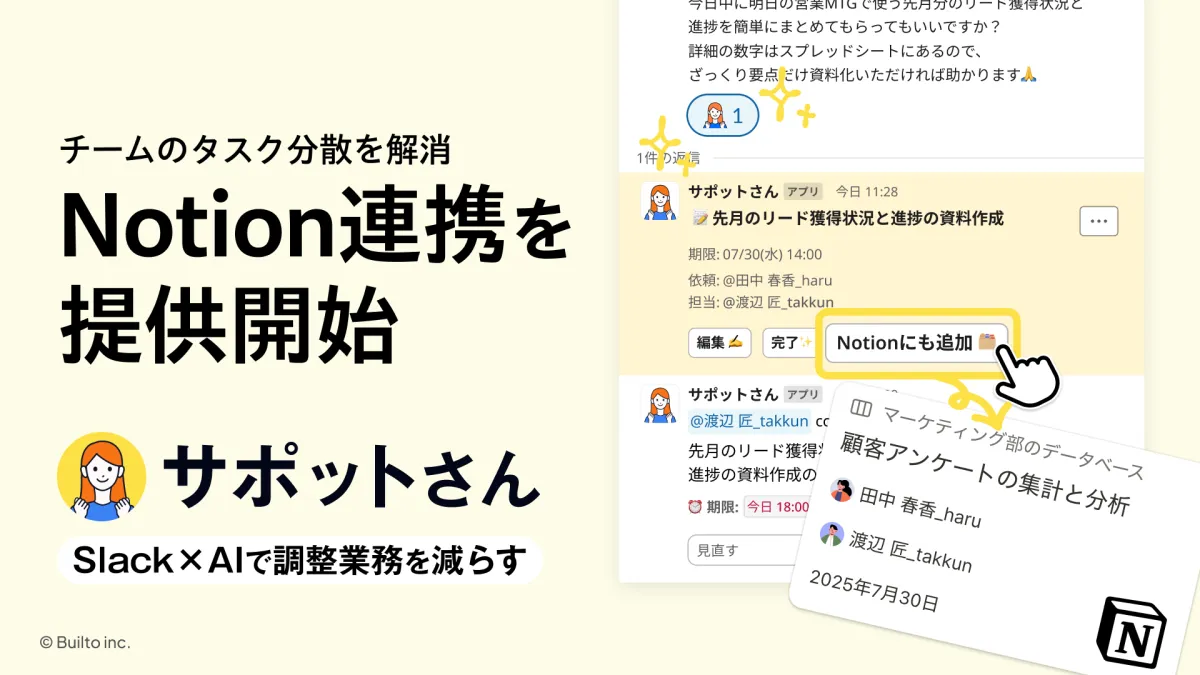 株式会社Builtoが提供するSlack連携AIタスク管理ツール『サポットさん』が、2025年7月より新たにNotionとの連携機能を正式に開始しました。この機能は、タスク管理をより円滑に行いたいチームにとって大きなメリットをもたらすことでしょう。