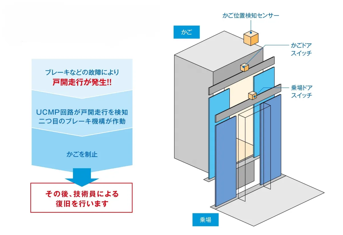 戸開走行保護装置は、二重ブレーキを備えた巻上機、専用電気回路、ドアスイッチ、かご位置検知センサーなどのシステムで構成されています。2009年9月28日以降に設置されたエレベータには、法律によってこの装置の設置が義務づけられていますが、それ以前に設備されているものに関しては設置が義務ではないものの、安全対策としての導入が推奨されています。地方公共団体でも、補助制度を設けてこの装置の普及促進を進めています。