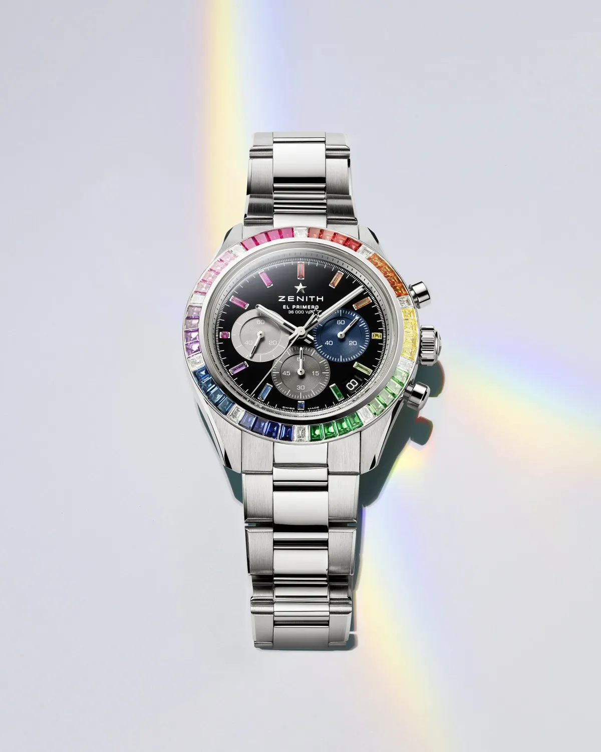 この時計は、高振動のクロノグラフ技術を象徴する「エル・プリメロ 3600」を搭載しており、そのユニークなデザインが一際目を引きます。41mmのケースに収められたラグジュアリーでカラフルなジェムストーンが、美しいハーモニーを奏でます。特に、バゲットカットのサファイアやダイヤモンドがセットされたベゼルは、全体にわたるレインボーカラーで華やかさを増し、腕元に輝きを与えます。