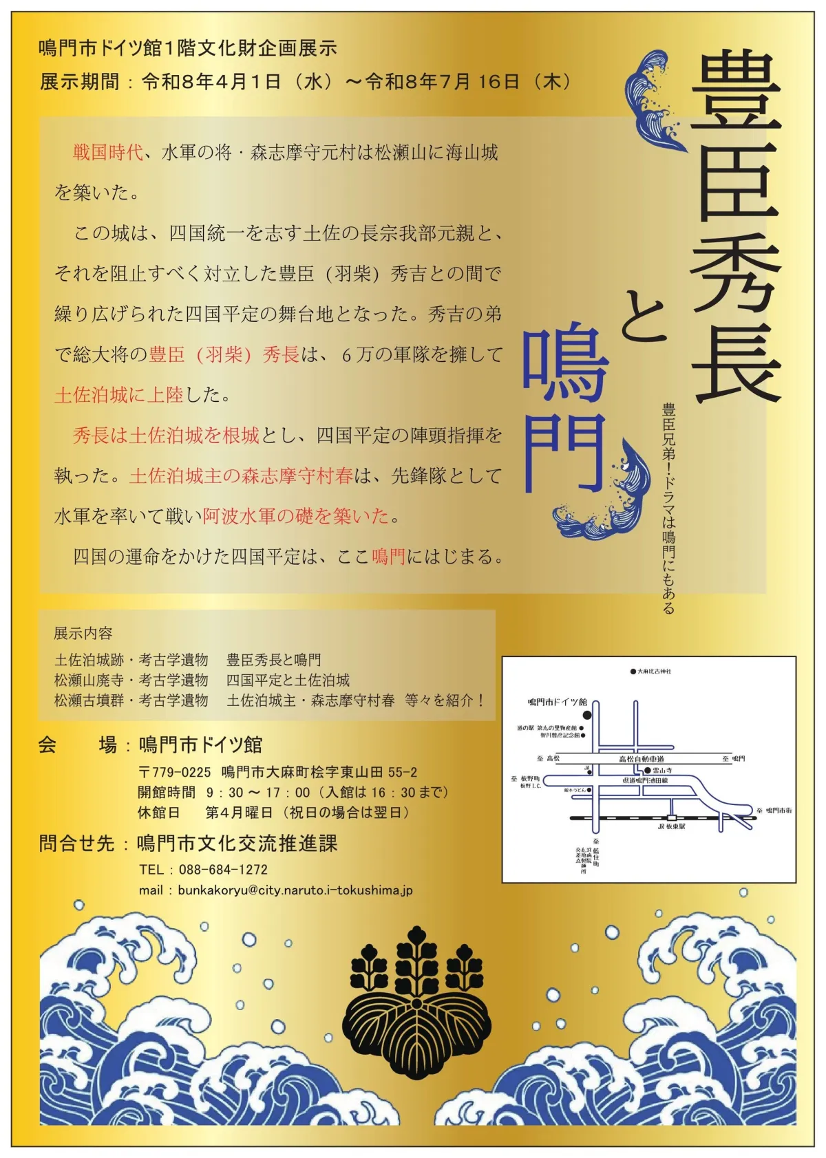 2024年4月1日から7月16日まで、鳴門市のドイツ館で「豊臣秀長と鳴門 豊臣兄弟!ドラマは鳴門にもある」という特別展示が開催されます。この展示は、戦国時代における鳴門の歴史的な役割にスポットを当てています。
