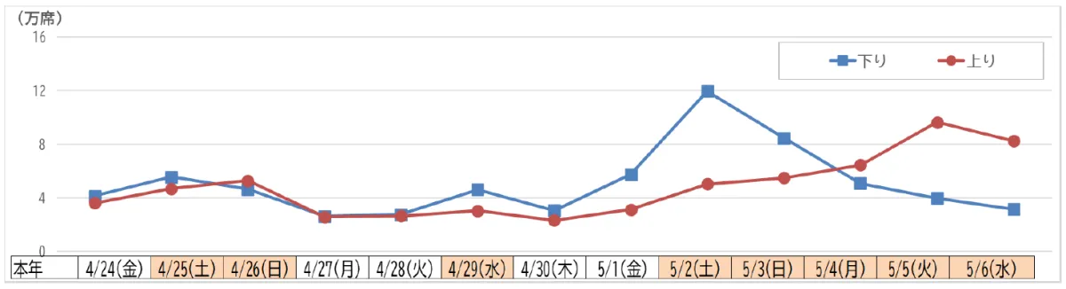 - - 下りのピーク日: 5月2日(土) - 約12万席の予約