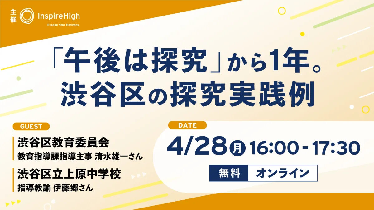 2023年4月28日、東京都渋谷区において、探究教育に特化したオンラインセミナーが開催されます。このセミナーはEdTech教材を提供する企業、株式会社Inspire Highが主催しています。渋谷区の新たな教育モデルとして注目されている「シブヤ未来科」を中心に、午後の授業を探究の時間として充実させる取り組みが議題となります。