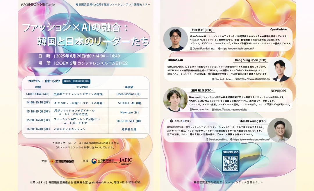 2025年8月20日(水)、韓国・ソウルにて「韓日国交正常化60周年記念 ファッションテック国際セミナー」が開催されます。この記念すべきイベントには、企業向け生成AIプラットフォームを提供する株式会社AuthenticAIの代表、上田徹氏が登壇し、生成AIとファッションの未来について講演を行います。