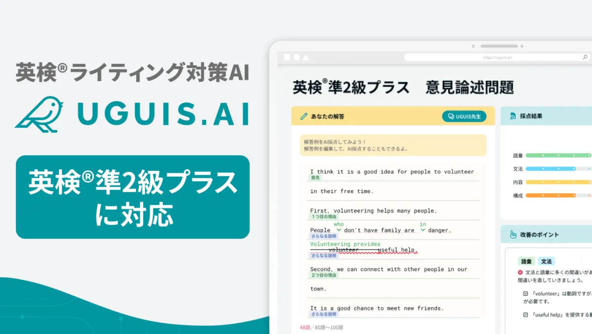 準2級プラスは新設されたばかりで、過去問も少なく、受験対策はまだ発展途上です。それだからこそ、教育測定研究所は「UGUIS.AI」に新しいコンテンツを導入することを決定しました。これにより、受験者がご自身のペースで準2級プラスの試験対策を進められるようになります。専門家チームが分析した豊富なデータを基に、準2級プラスに特化した問題形式と出題傾向を反映した学習コンテンツを提供します。