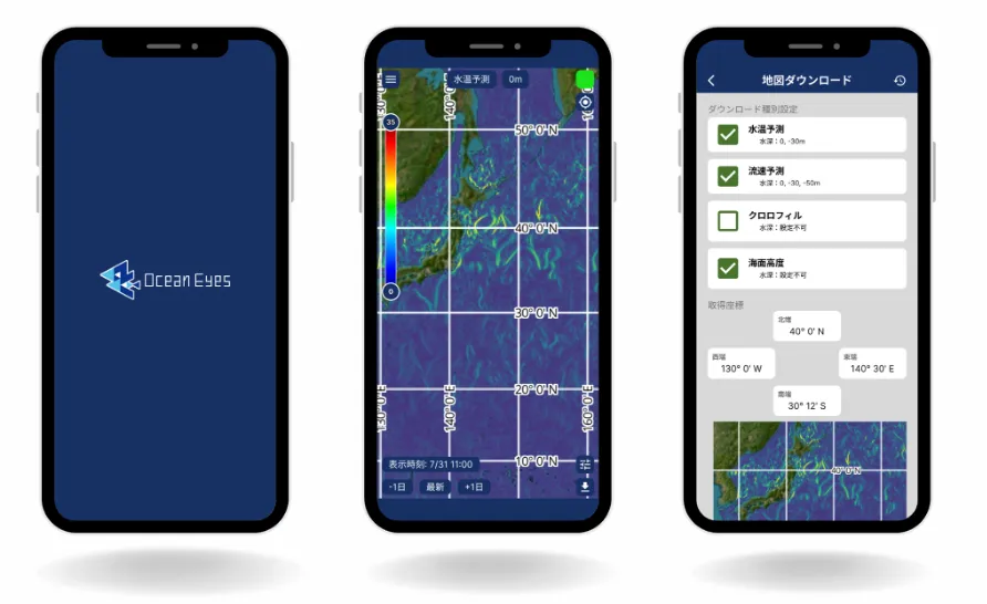 - - 水温予測、流速予測、クロロフィル濃度、海面高度など、重要な海況データを分かりやすく表示。