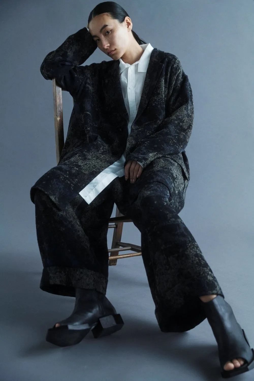 特に注目すべきは、ジャガード織のアシンメトリージャケットとフロントタックパンツです。これらのアイテムは、しなやかで柔らかい素材感が特徴。織りによって生まれる奥行きと立体感が、他にはない魅力を持っています。限定カラーはブラックで、通常はブルーが展開されています。