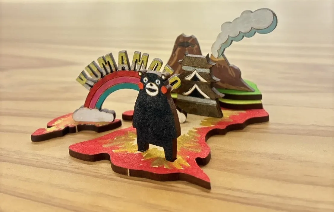 ワークショップで使用するキットには、人気スポット「熊本城」や「阿蘇山」を模したパーツが含まれており、熊本県の形をした台座に装飾されます。参加者はこのキットを用いて、自分だけのミニディスプレイを完成させることができます。イベントが終了した後も、気に入った作品を持ち帰ることができるので、完成までの過程を楽しむと同時に、思い出として残すこともできます。