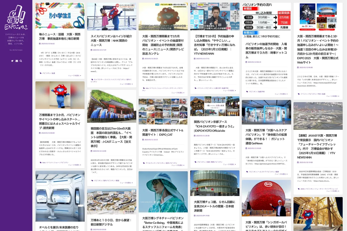 『EXPOニュースくん』は、毎日大阪・関西万博に関するニュースを自動収集し、公式情報はもちろん、民間企業や自治体の取り組み、さらには個人ブログの情報まで、関連する多様なニュースを掲載しています。万博開催が迫る中、各種パビリオンや関連イベントのニュースが増える一方で、一般にはあまり知られていない情報も多く存在します。このような情報を集約することで、万博の全貌を像するとともに、さまざまな角度からの着実な準備の様子を浮き彫りにしています。