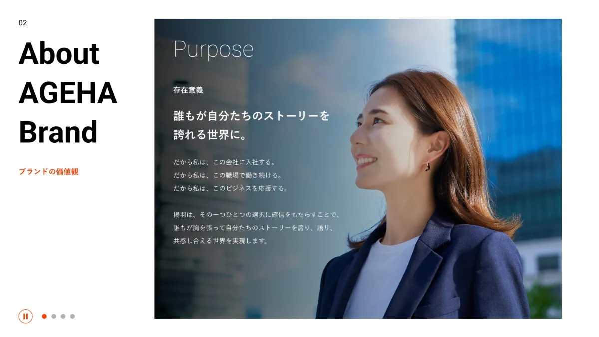 揚羽はこれまでに策定した「ブランドガイドライン」をWebサイトとして公開し、さらなる認知を狙っています。このサイトでは、企業のパーパスやミッション、ビジョンなどがビジュアルとテキストで表現されており、ユーザーが直感的に理解しやすい設計になっています。これにより、企業の理念を論理的に把握できるように工夫されています。
