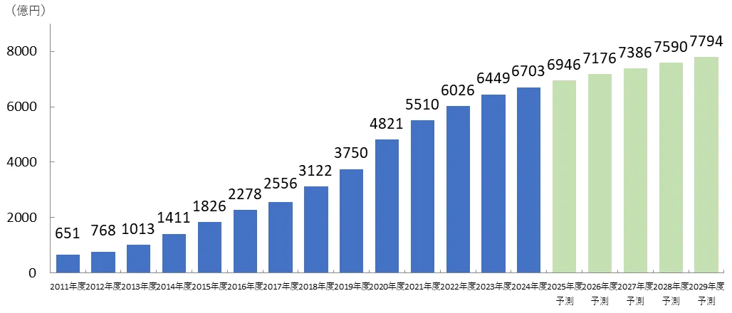 株式会社インプレスが発表した調査によると、2024年度の日本国内電子書籍市場は前年に比べ3.9%増の6703億円に達する見込みです。これにより、2023年度の6449億円から254億円の増加が期待されています。市場は今後更なる成長を遂げ、2029年度には8000億円弱に到達すると予測されています。