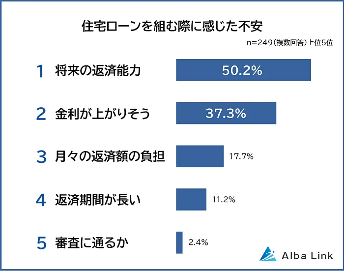 この調査結果から得られた不安要素をランキング形式で見ていきましょう。最も多かった不安は「将来の返済能力」で、全体の50.2%がこの点を挙げています。