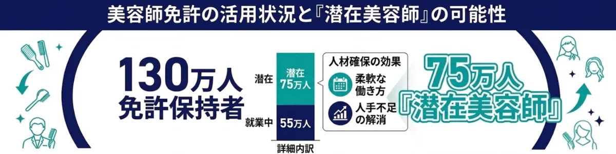 厚生労働省によると、日本には約130万人の美容師免許保持者がいるものの、実際に現場で働いているのは約55万人に過ぎません。つまり、約75万人の「潜在美容師」が存在しており、その多くが育児や副業などライフスタイルに合わせた柔軟な働き方を求めています。