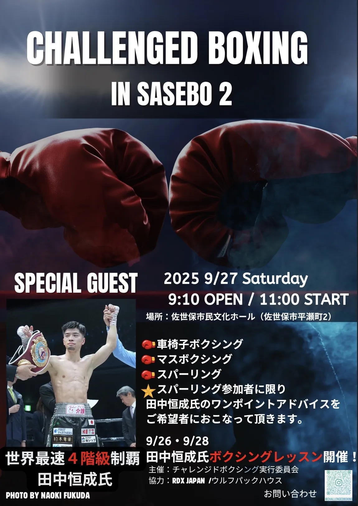 2025年9月27日、長崎県佐世保市にて新しい形の格闘技イベント「CHALLENGED BOXING IN SASEBO」が開催されます。このイベントは、誰もが楽しめる多様なプログラムを提供し、特に車いすボクシングに注目が集まっています。さらに、元WBO世界フライ級スーパー王者の田中恒成選手による特別なボクシングレッスンも行われるため、大きな期待が寄せられています。