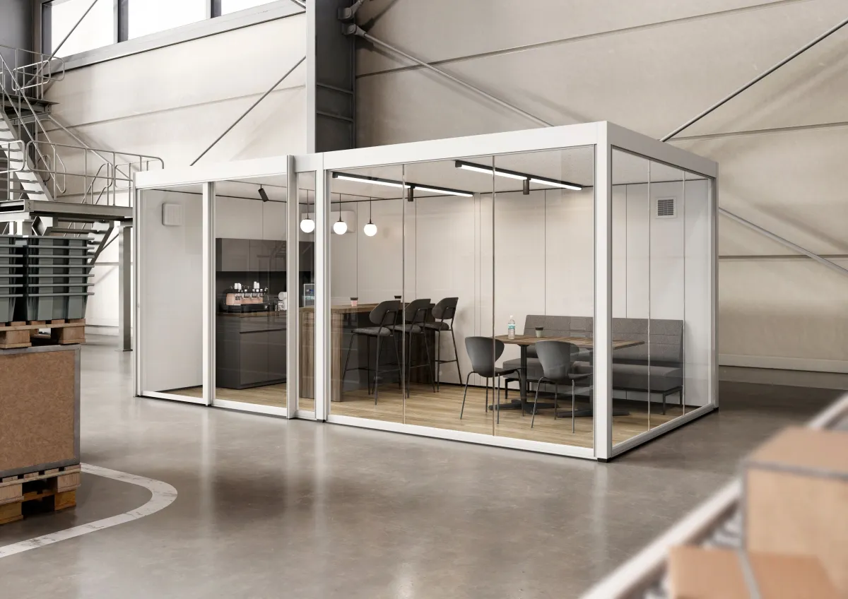 工場稼働への影響を最小限に抑えるため、工期は約1週間程度と短く、従来の休憩室設置に比べて圧倒的なスピード感を持っています。 ユニット内のレイアウトは自由度が高く、カフェカウンターやミーティングテーブルなど、さまざまな用途に応じた配置が可能です。
