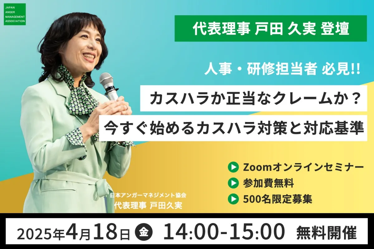 一般社団法人日本アンガーマネジメント協会が開催する「カスハラか正当なクレームか?今すぐ始めるカスハラ対策と対応基準」と題した無料オンラインセミナーが、4月18日14時から行われます。このセミナーの主な講師は、協会の代表理事である戸田久実氏です。