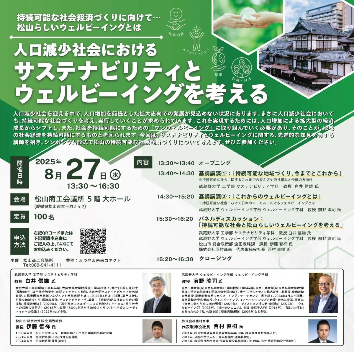 2025年8月27日(水)、愛媛県松山市にて、武蔵野大学と松山商工会議所が共催するセミナーが開催されます。このイベントでは、人口減少社会における持続可能な地域の形成について、さまざまな視点から議論される予定です。このセミナーの受講は事前申込制で、受講料は無料となっています。