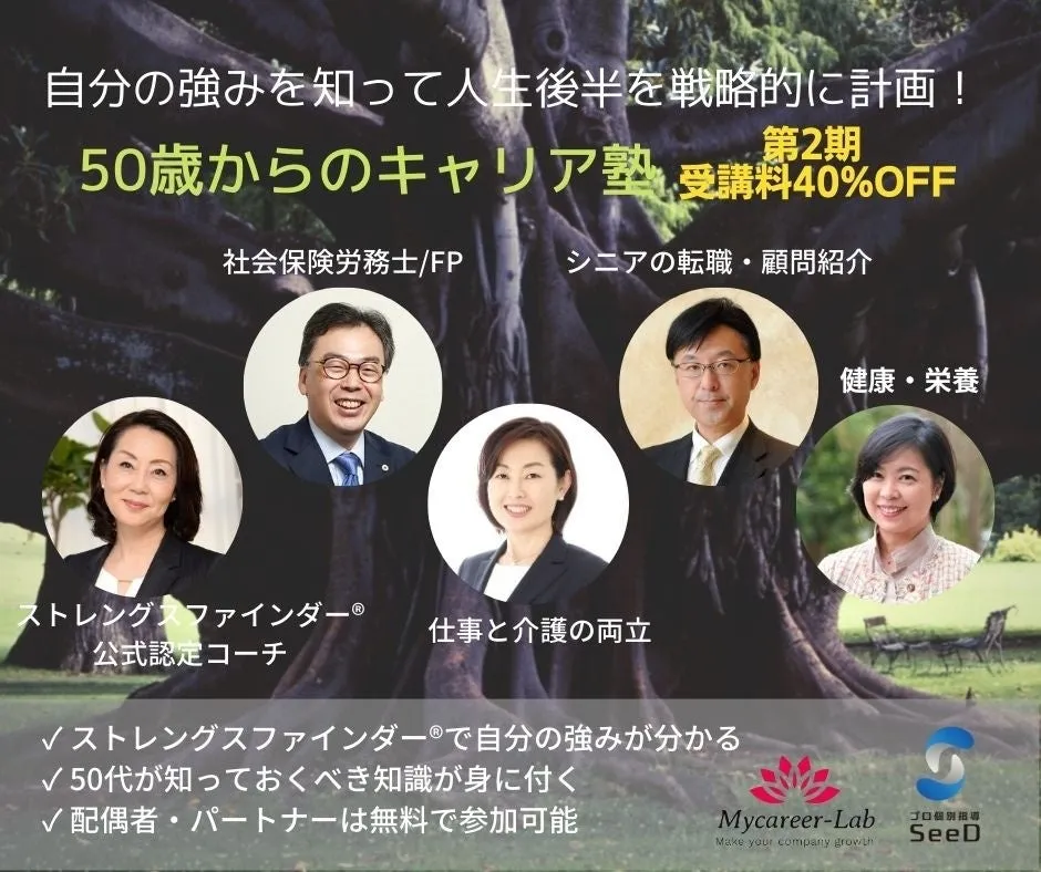このキャリア塾では、特に50代の方々が知っておくべき重要な知識を手ごろな価格で学ぶことができます。また、参加者はストレングスファインダー®を通じて自分の強みを見つけることができるため、自己理解を深め、自信を持ったキャリアデザインが可能になります。