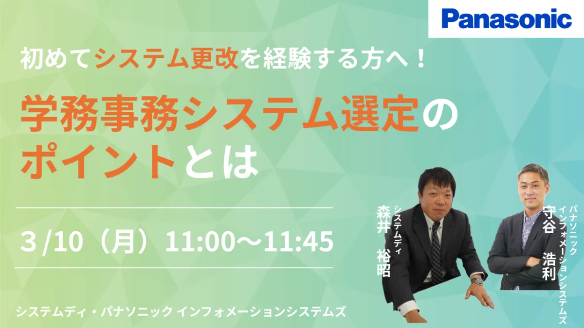 2025年3月10日(月)に、パナソニック インフォメーションシステムズ株式会社主催のオンラインウェビナーが開催されます。このウェビナーは、初めて学務事務システムの更改を担当する方に向けて設計されており、参加は無料です。時間は11:00から11:45までの約45分間です。