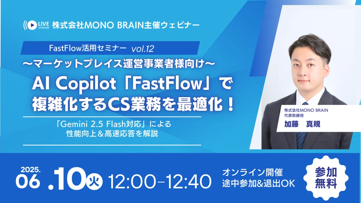 2025年6月10日、株式会社MONO BRAINが主催する「FastFlow」新機能解説ウェビナーが開催されます。このウェビナーは、マーケットプレイスの運営事業者を対象にした無料のオンラインイベントで、最新のAI技術をカスタマーサポート業務にどのように活用できるかを詳しく解説します。