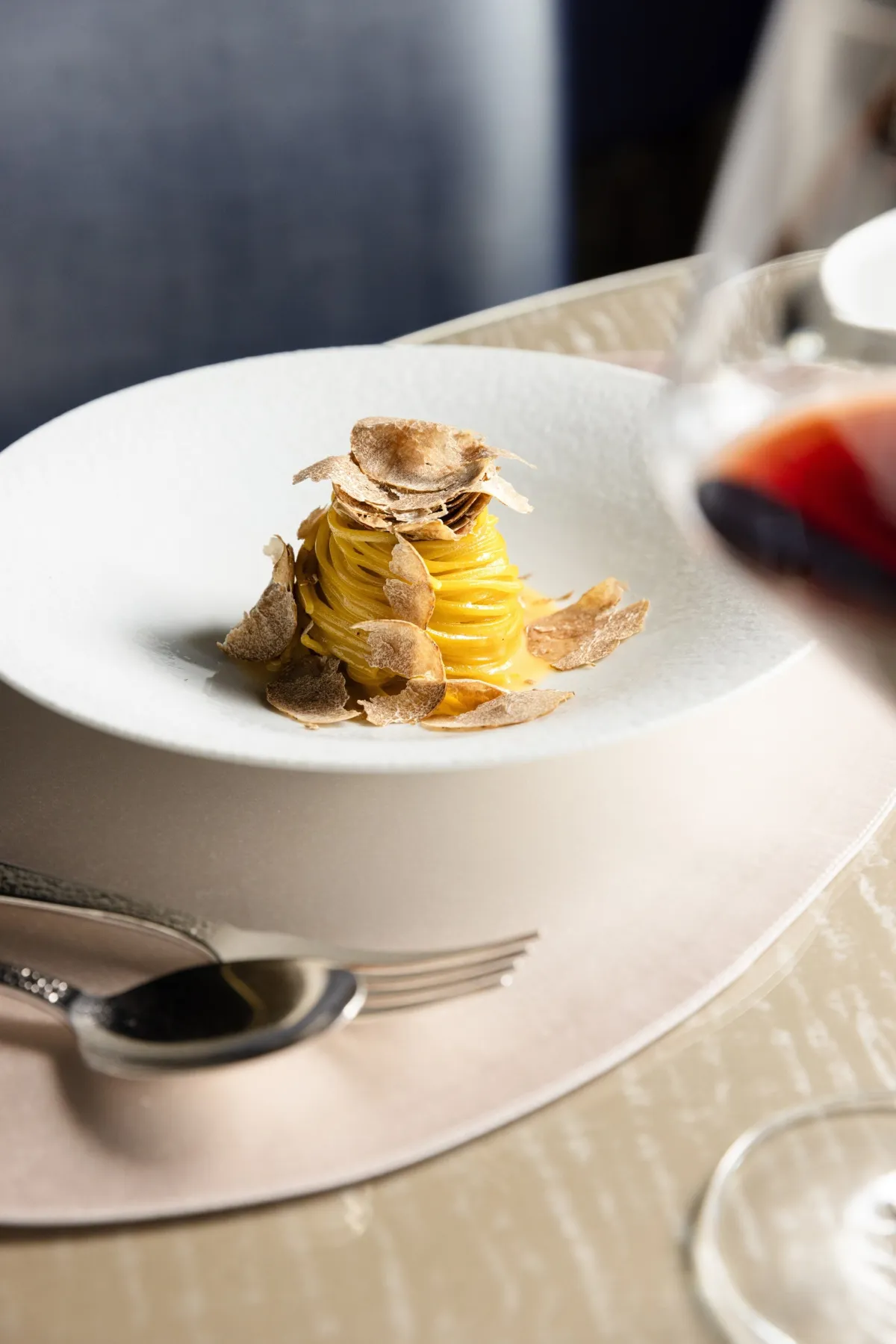 イタリアのクリスマスの伝統料理であるトルテッリーニ イン ブロードが、この特別メニューの一皿目です。これは詰め物を施した小さなパスタを澄んだスープで味わうもので、寒い季節にぴったりの温かみのある料理です。また、日本で厳選されたオーガニック卵とイタリア産セモリナ粉を用いて作るフレッシュなタリオリーニは、ピエモンテ産のホワイトトリュフの香りがついたバターと、仔牛のブロードを合わせ、さらにフレッシュトリュフのスライスをふんだんにトッピングした贅沢な一皿。これまでの料理とは一線を画し、食材そのものの魅力が引き出された逸品に仕上げています。