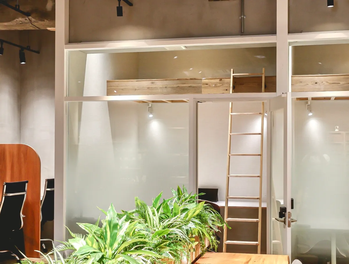 ご覧の通り、全ての個室には約3畳分のロフトが完備されています。このデザインにより、執務エリアのスペースを有効活用でき、物置としての無駄な空間を減少させます。プライベートストレージとして利用できるロフトの存在が、作業環境の集中力を生み出すのです。