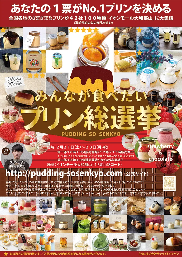 2026年2月、関西・東海・関東地方を中心にイベントを展開する株式会社サテライトジャパンが、イオンモール大和郡山にて「第19回みんなが食べたいプリン総選挙」を開催します。日程は2月21日(土)から23日(月・祝)の3日間です。