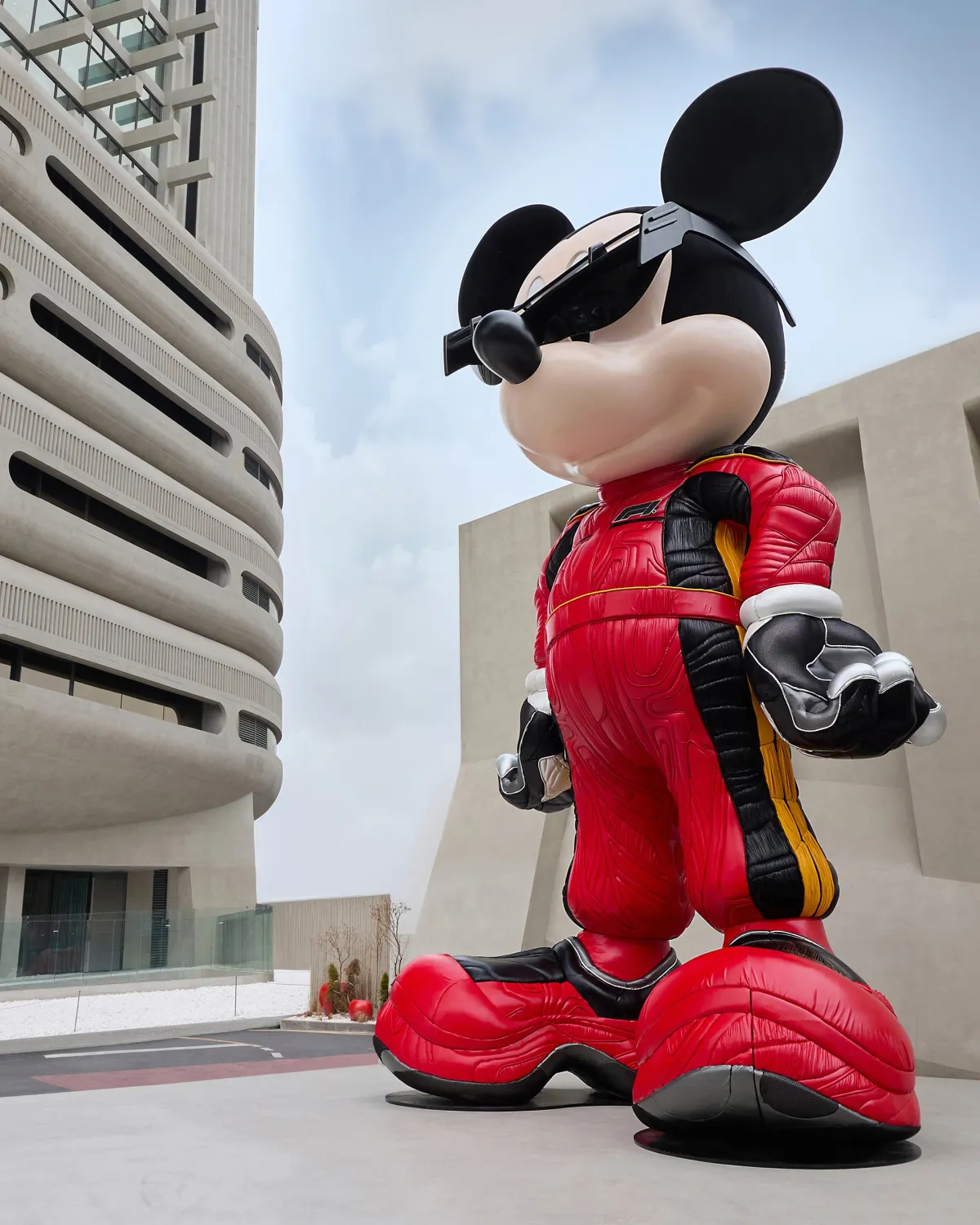 このコレクションのローンチを記念して、GENTLE MONSTERは特別なポップアップイベントを開催。ソウルと上海の2都市で実施されるこのポップアップには、リアルなF1®マシンが展示され、来場者にレーシングの興奮と新しい体験を提供します。特に目を引くのは、圧倒的なサイズを誇る「ミッキーマウス」オブジェ。これとF1®マシンが共演することで、スピード感とファンタジーが融合した特別な空間が演出されます。このようなユニークな空間は、デザインのストーリーを強化する役割を果たしています。