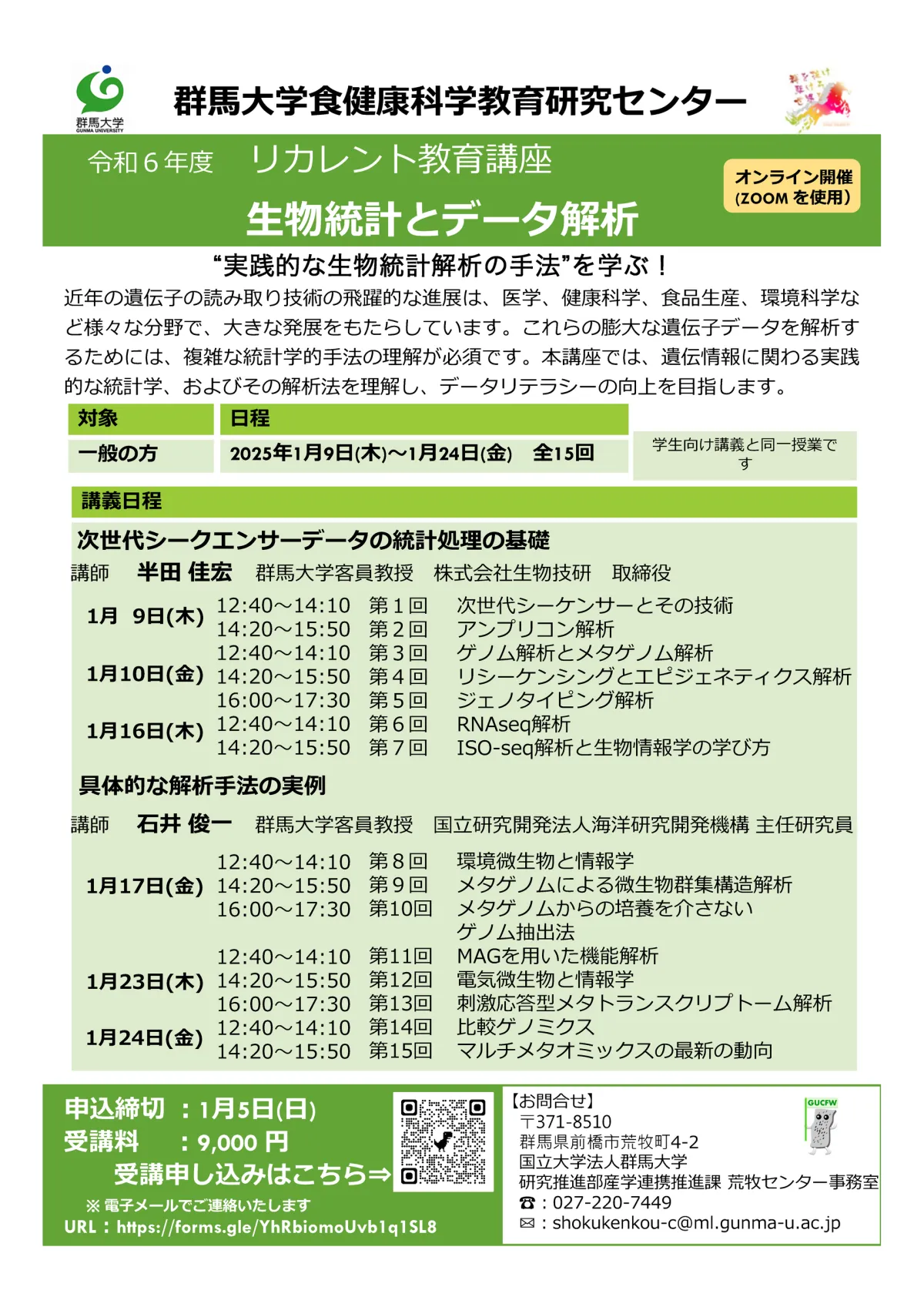 群馬大学の食健康科学教育研究センターは、遺伝子データ解析に必要な生物統計の技術を学ぶオンライン講座を提供します。この講座は、急速に進化する遺伝子解析技術に対応するため、医学や環境科学など様々な分野に役立つ内容となっており、参加者のデータリテラシー向上を目指しています。