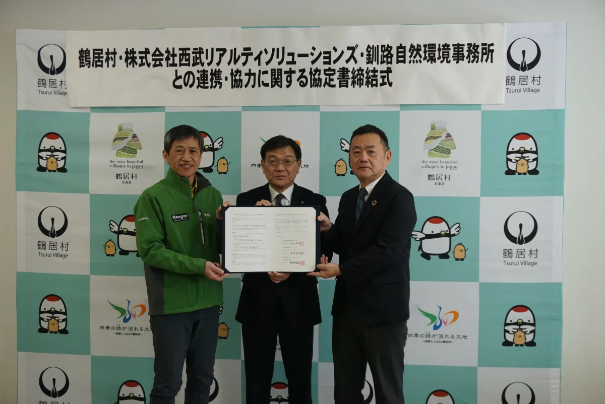 今回、この「宮島岬エリア」において、地域振興と自然環境の保全を目的とした新たな連携協定が締結されました。締結されたのは、鶴居村、土地所有者の株式会社西武リアルティソリューションズ、そして土地を所管する釧路自然環境事務所の3者です。