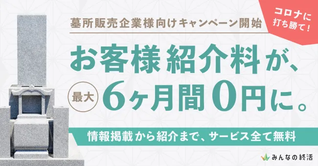 新型コロナウイルスの影響により、私たちの生活スタイルは大きく変化しました。葬儀やお墓業界も同様に、オフラインからオンラインへのシフトが急務となっています。このような現状を踏まえ、オンライン集客の支援を行う「みんなの終活」としては、全国の石材店や墓所販売会社の支援に向けた施策が必要と考え、今回のキャンペーンを実施することになりました。